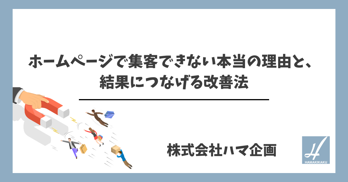 ホームページで集客できない理由は、ターゲットが不明確、SEO対策をしていない、コンテンツの質の低さ、効果測定をしていない、改善しないことなどです。ホームページから集客するには、ターゲットを定めて、検索エンジンに評価されるSEO対策を行い、品質の高いコンテンツをつくり、そしてウェブ解析を基にした継続的な改善です。