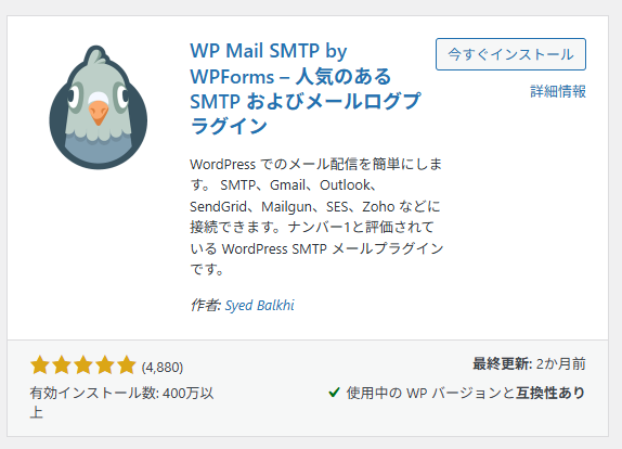 状況を打破するために試したのは、もちろんWP Mail SMTPというプラグインです。以前はこれでドハマりしたので、この鳩ちゃんの顔はよく覚えています。今回だって、調べるとこの子ばかり出てきた…