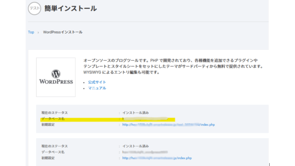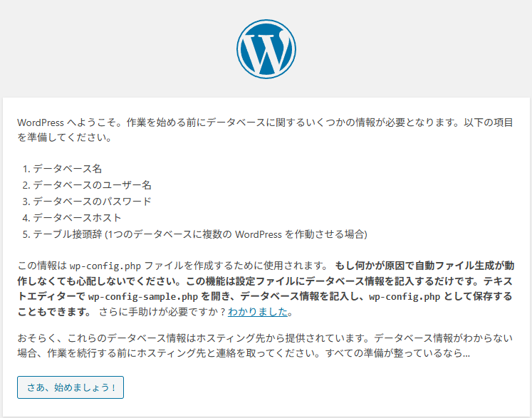 単に私が行き急いでいるだけかもしれないけど、初期設定のURLリンクをクリックして、すぐに例の画面になり、「データベース情報が必要です」と言われて「はて?そういえば、DB作ったっけ・・・」と。