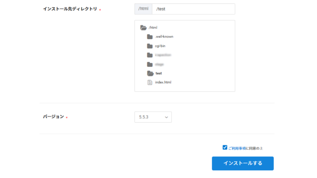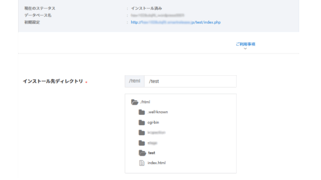 まずはインストール先を指定。あらかじめFTPで空フォルダ(ここでは「test」)を作り、ここにWPをインストールします。