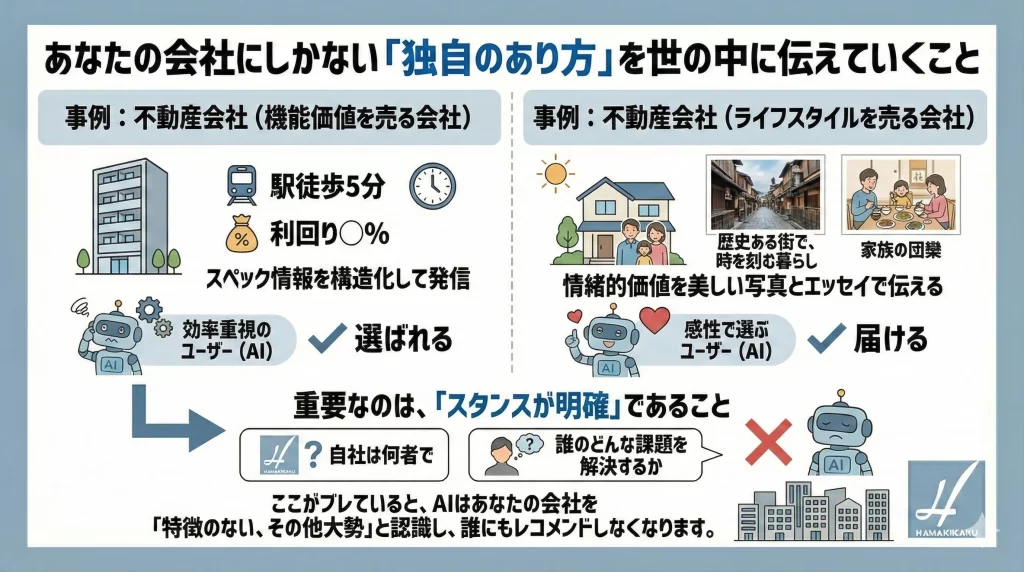 「歴史ある街で、時を刻む暮らし」や「家族の団欒」といった情緒的価値を、美しい写真とエッセイで伝え、感性で選ぶユーザー(AI)に届ける戦略。